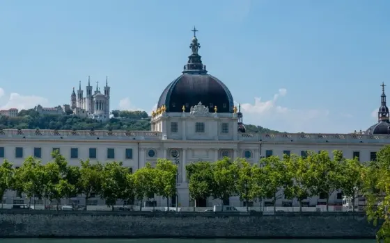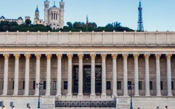 Sehen Sie das elegante neoklassizistische Justizgebäude an der Saône mit seiner imposanten Säulenreihe.